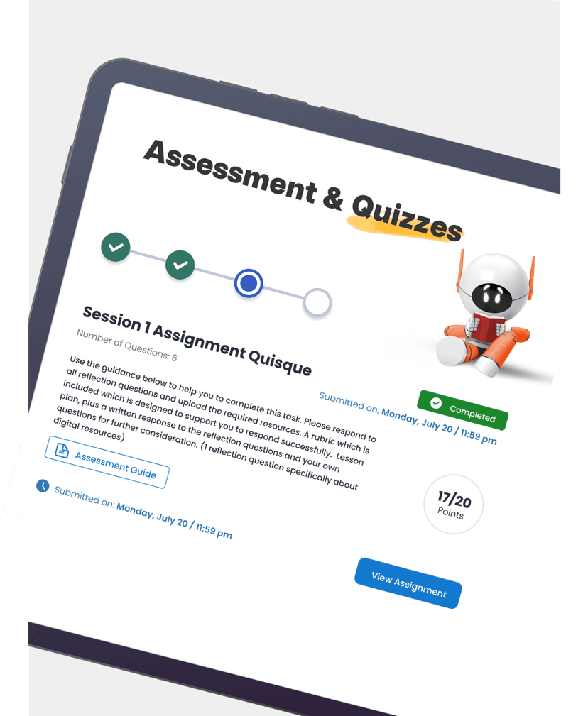 - Meaningful assessment tools: After completing the materials, teachers apply their acquired skills in the classroom, recording evidence and student work samples as submissions to pre-loaded platform tasks. To guide future instructional decisions, teachers are assessed using teaching scenario questions at the end of the learning path.