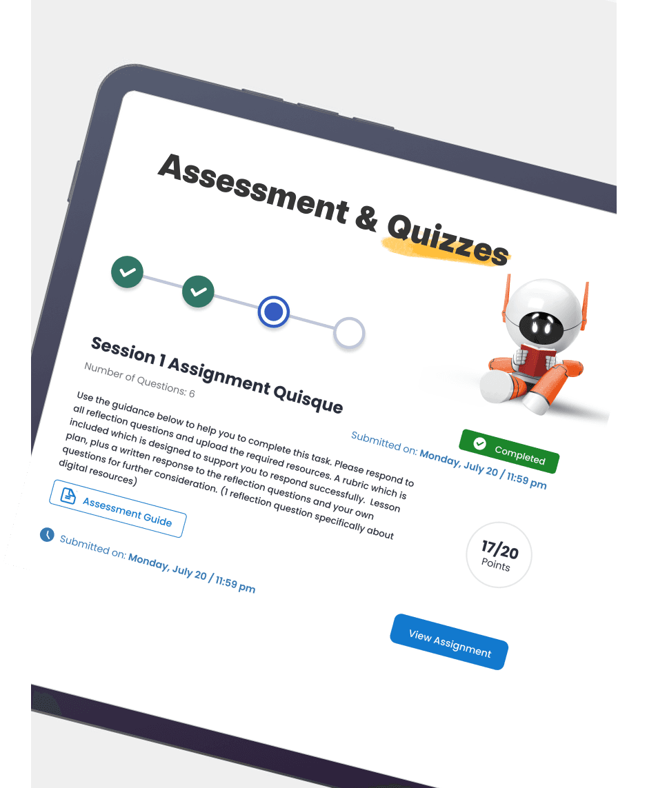 - Meaningful assessment tools: After completing the materials, teachers apply their acquired skills in the classroom, recording evidence and student work samples as submissions to pre-loaded platform tasks. To guide future instructional decisions, teachers are assessed using teaching scenario questions at the end of the learning path.